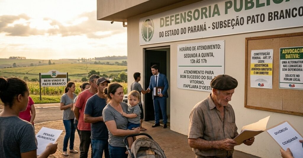 Isso significa que cidades como Dois Vizinhos, Coronel Vivida, Chopinzinho, Barracão, Marmeleiro, Palmas, Ampére, Realeza, Salto do Lontra, Santo Antônio do Sudoeste, São João, Mangueirinha e Clevelândia, entre outras, não possuem atendimento regular da Defensoria Pública. Se você mora em qualquer uma dessas cidades e precisa de assistência jurídica gratuita, a Defensoria de Francisco Beltrão ou Pato Branco pode até atendê-lo em tese, mas na prática, a distância, o horário limitado e a enorme demanda dificultam muito esse acesso.